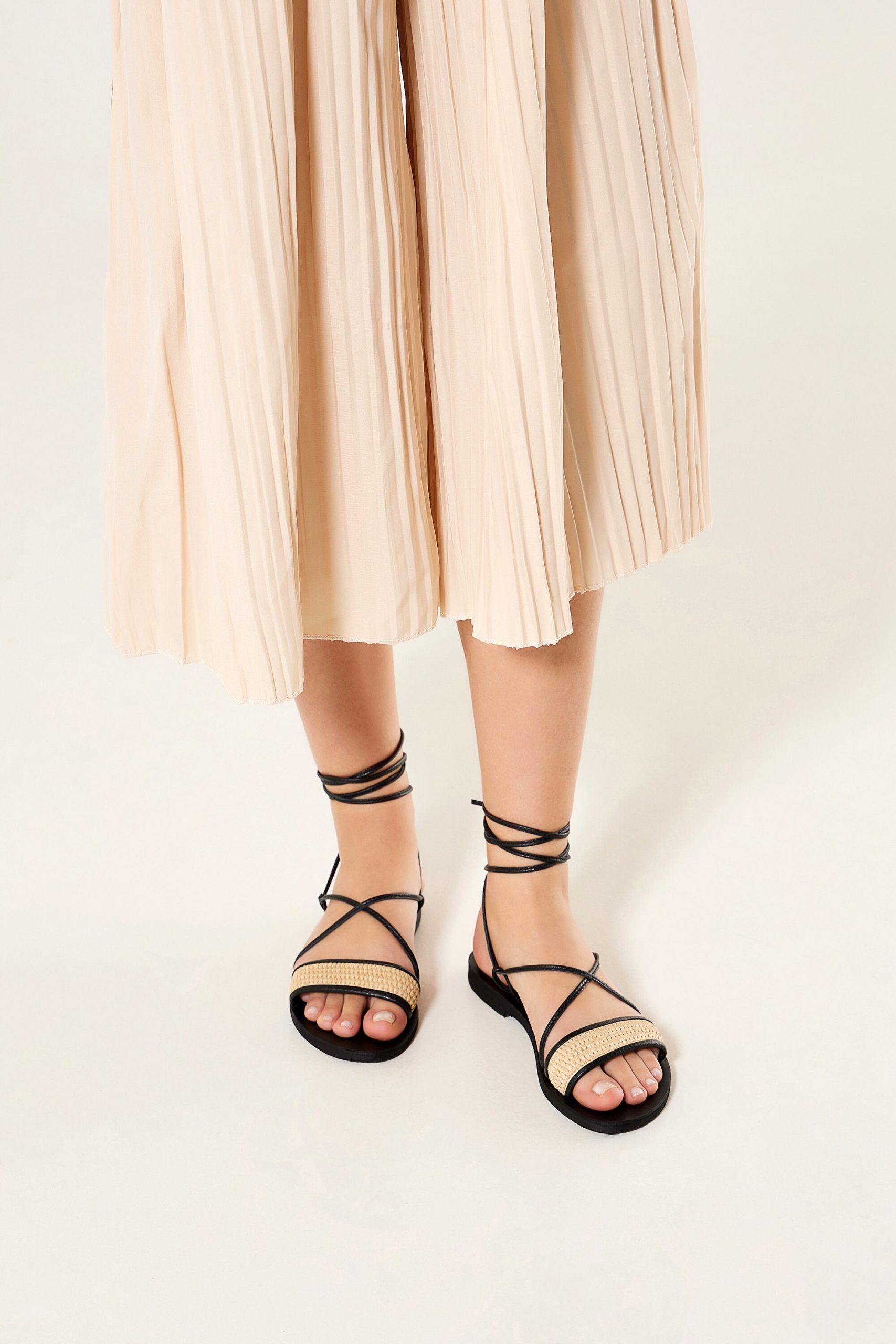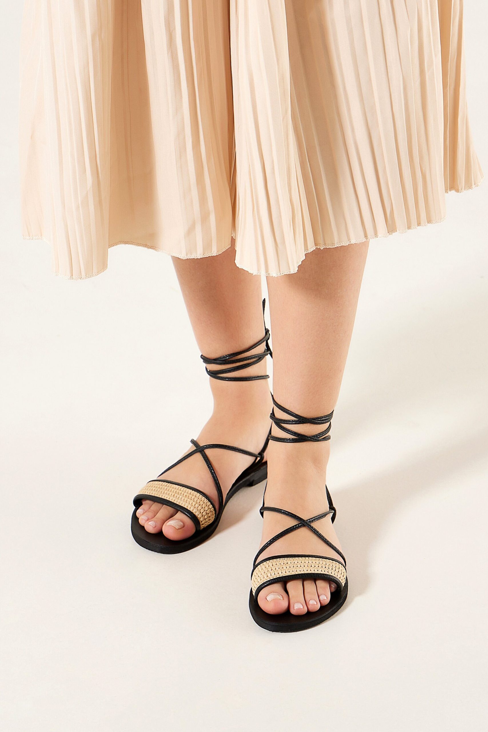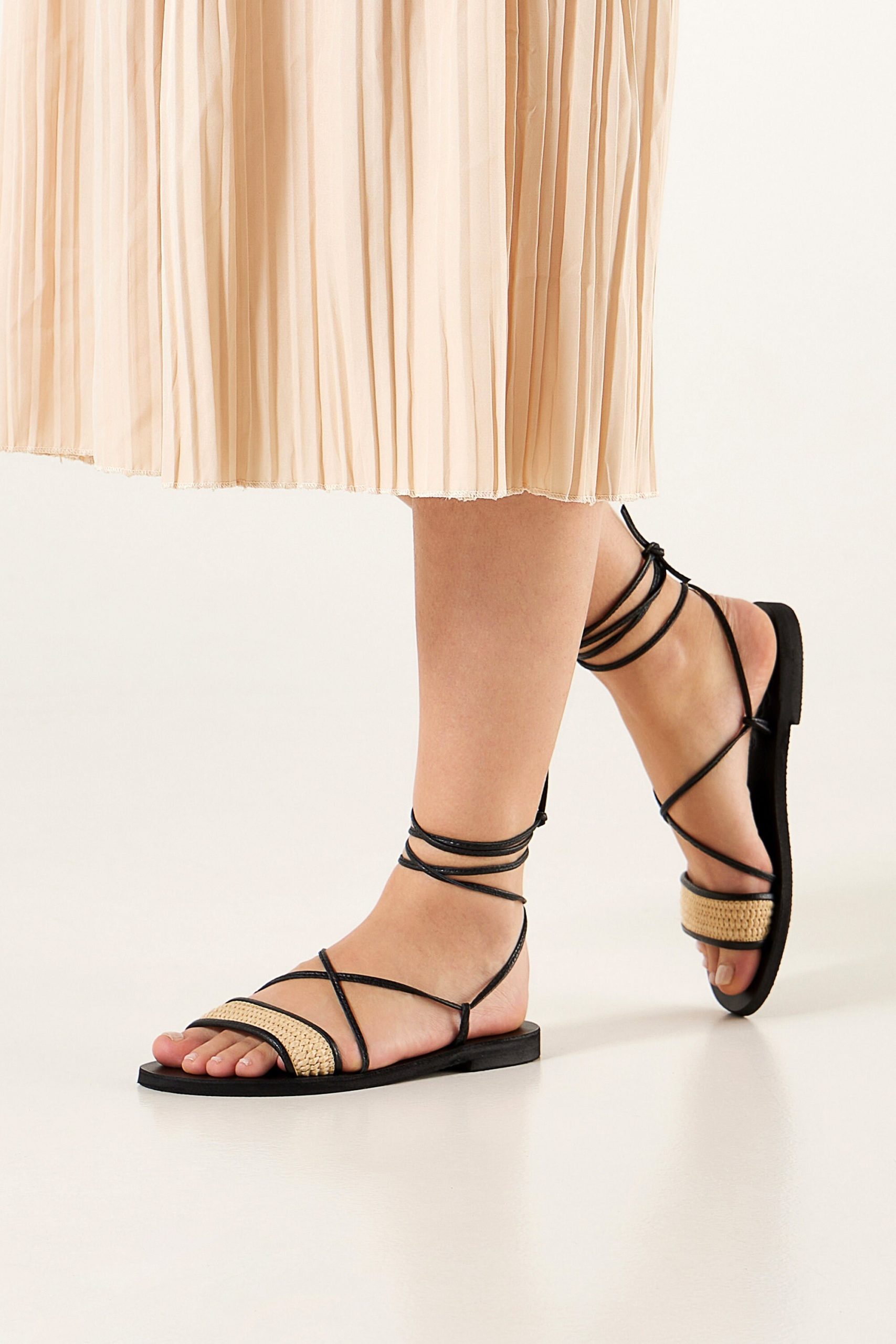 These black and natural woven strap wrap sandals blend laid-back summer charm with modern elegance. Designed with sleek black wraparound laces and a natural woven front strap, they bring texture and style together for a timeless warm-weather essential.