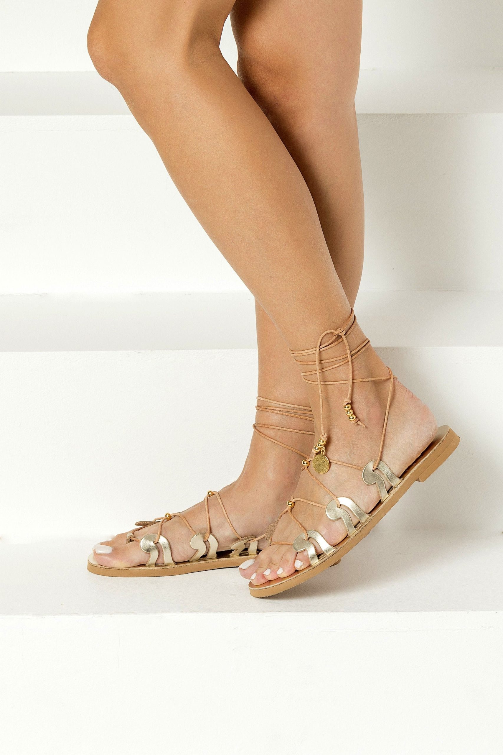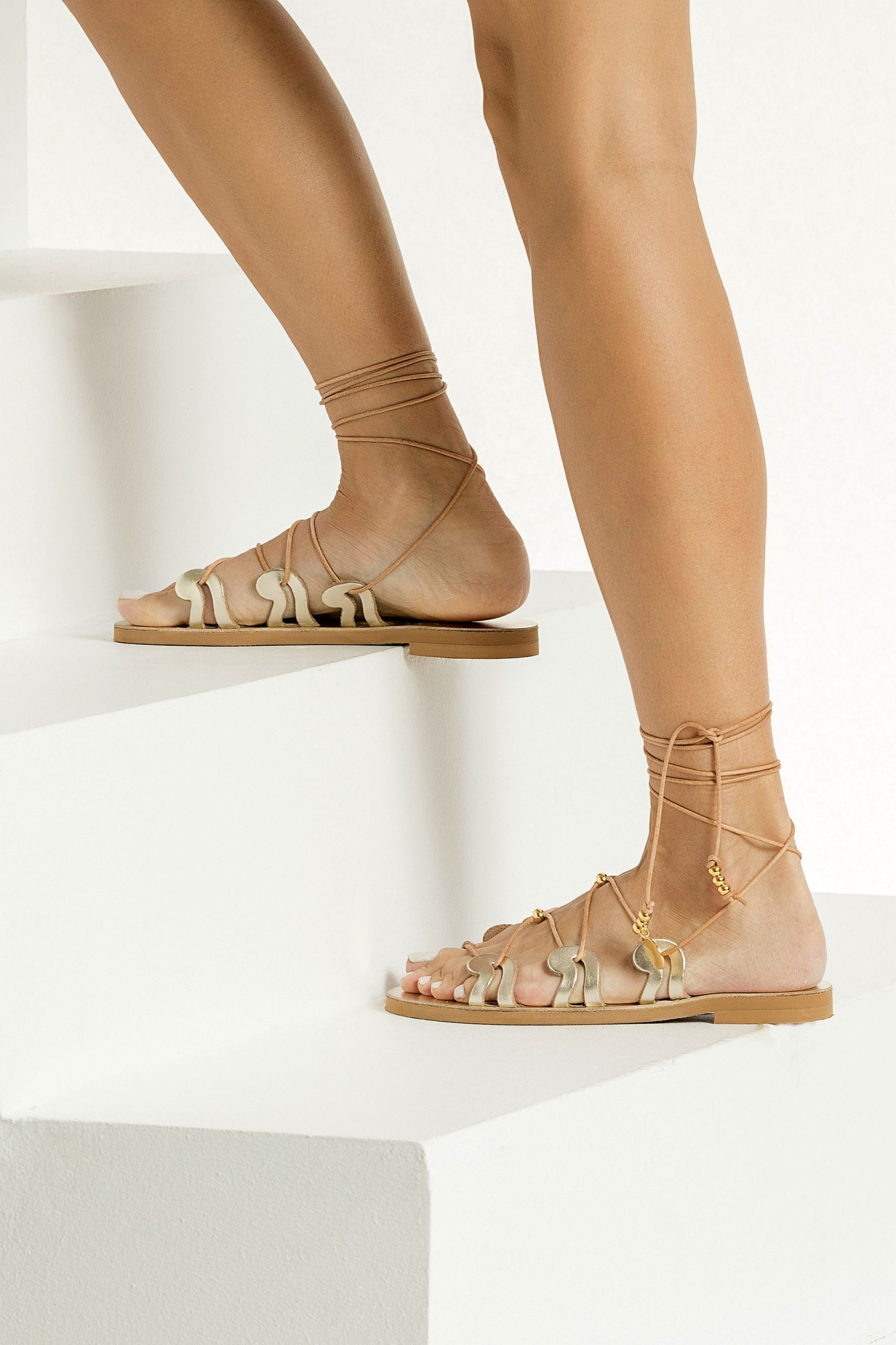 Design: Open-toe strappy silhouette with lace-up ankle ties